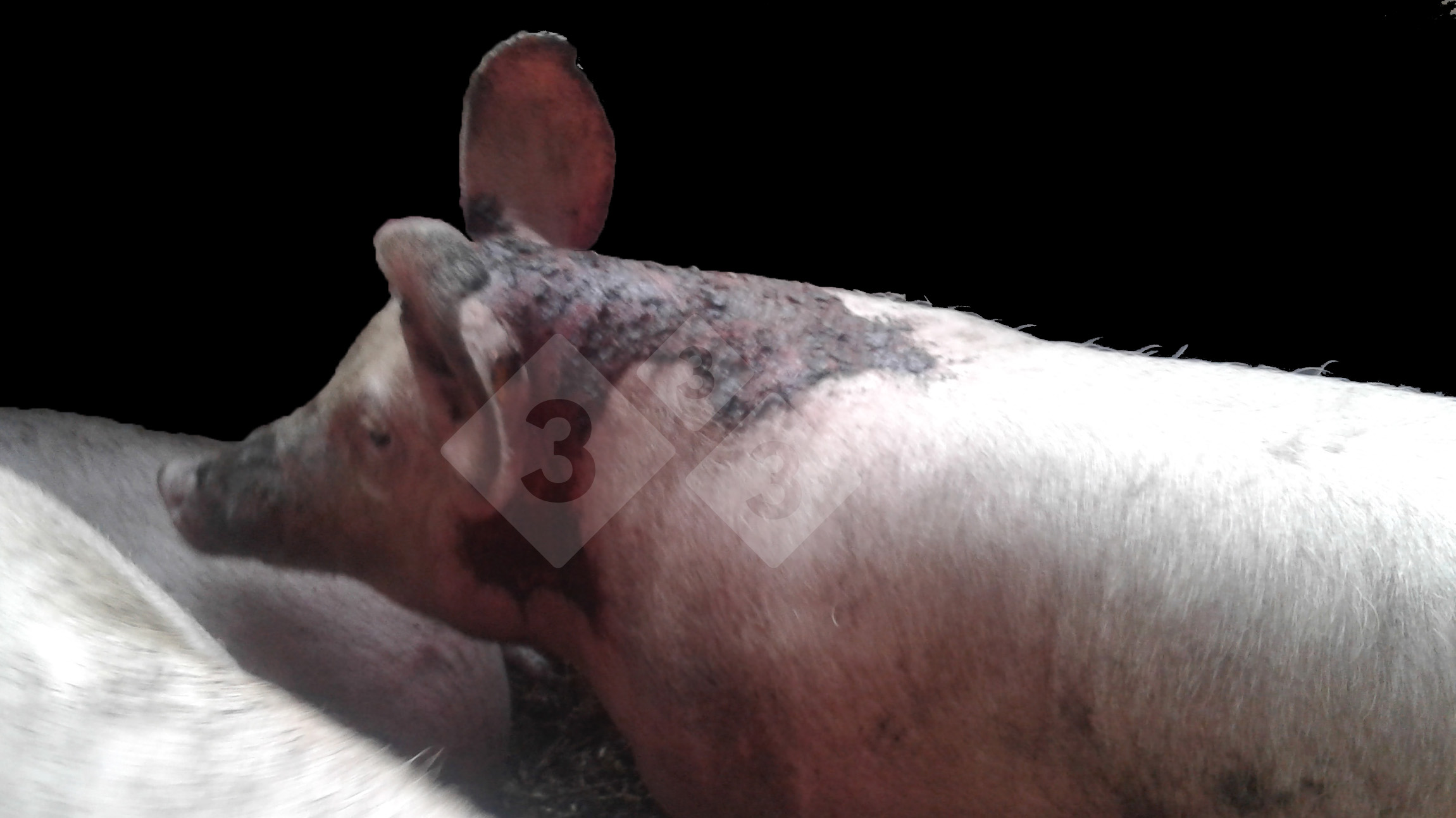 In differential diagnosis a bacterial skin infection, agressive behaviour of pen mates and burning can be included.