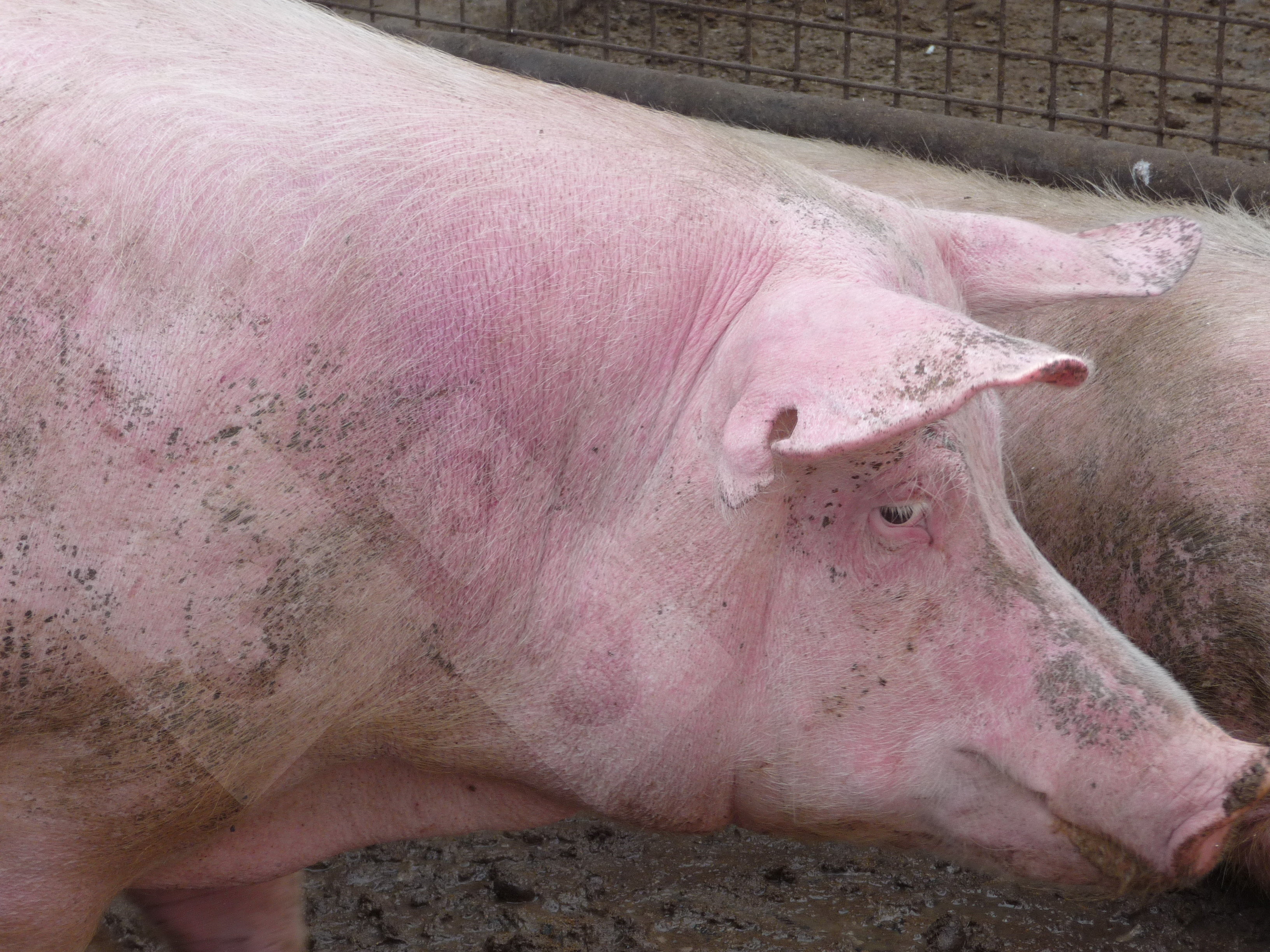 This sow has been left outdoors without shade to protect her for the sun. The white parts of the body become reddened, oedematous and irritable and the animals appear to be in pain.
