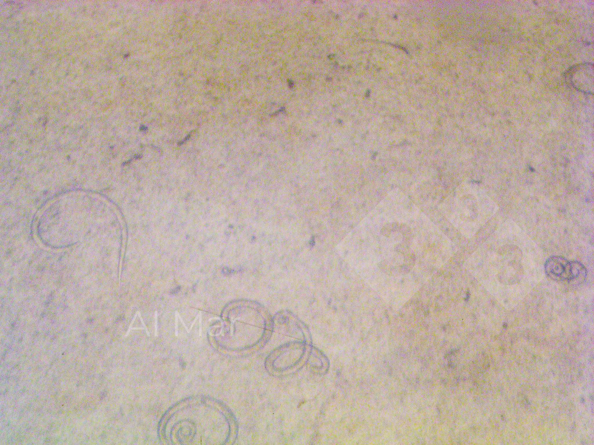 The larvae in the image (shown under the trichinoscope) have been extracted from the pillars of the diaphragm by artificial digestion.