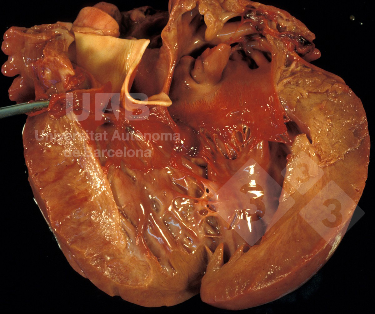 This picture corresponds to a dysplasia (malformation) of the atrioventricular valve in the left heart. There is also subvalvular aortic stenosis with secondary left ventricular hypertrophy (due to increase afterload placed on the left ventricle).