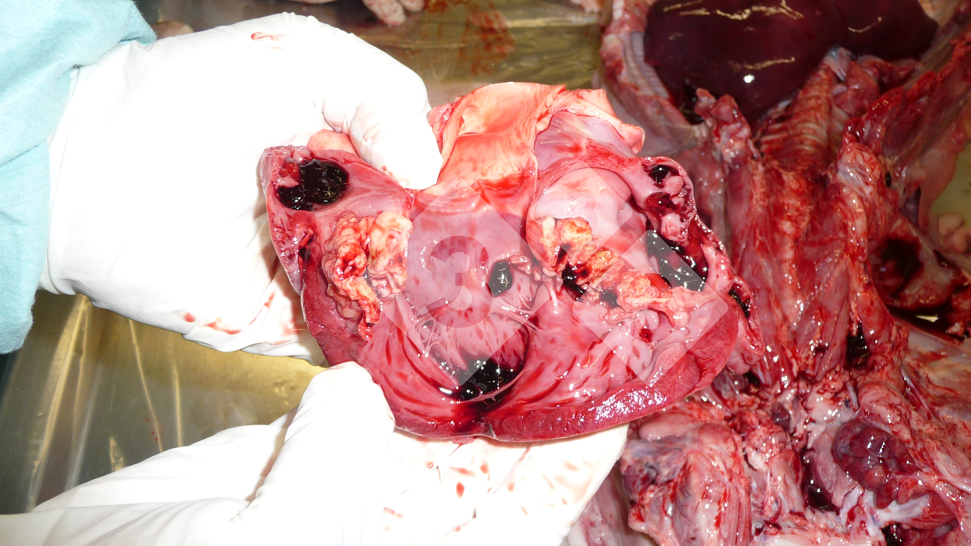 Endocarditis is defined as an inflammation of the cardiac endocardium. The infection can affect the valves (valvular endocarditis) and then spread to the heart wall (mural endocarditis). It is usually a result of a bacteraemia or pyaemia. The most commonly associated organisms isolated are Streptococcus suis and Erysipelothrix rhusiopathiae. Erysipelothrix rhusiopathiae was isolated in this case.