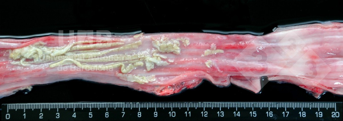 These whitish plaques over the esophageal mucosa correspond to a proliferation of the esophageal epithelium in response to a Candida albicans infection. It is usually observed in piglets and weaners and it is a consequence of other primary factors such as antibiotic therapy, inanition, immunosuppression or gastric reflux.