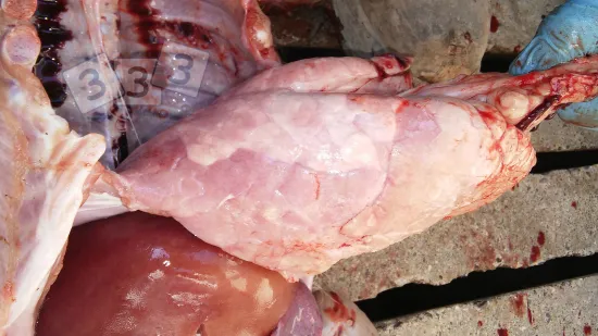What is the likely cause of this lesion seen in >10% of lungs in slaughter pigs each week from a breeder feeder farm?