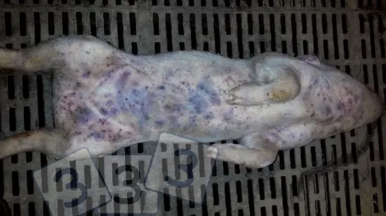 There is an increase in subcutaneous haemorrhages and bruises in the skin of piglets from 7 days of age, after being born normal. Mortality was high after few days of developing the clinical signs. What is the most likely cause of this lesion?