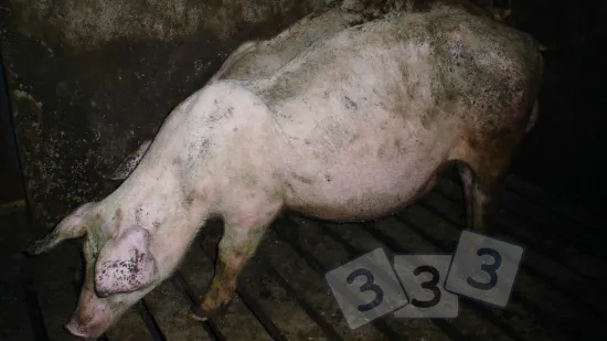 This sow has reddening of skin and considerable pain. What is the most likely cause of this lesion?