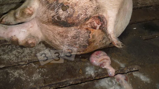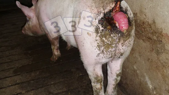 This pig has a mass protruding from behing. What is the most likely cause of this lesion?
