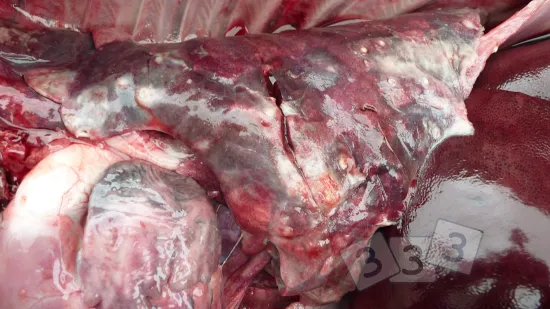 There is an increase of ill thrift and laboured abdominal breathing in the weaners. There is poor response to antimicrobial treatment. Mortality ranges from 4 to 30%. What is the most likely cause of this lesion?