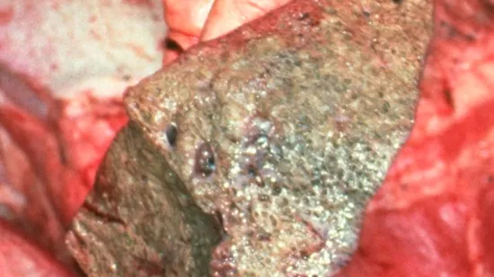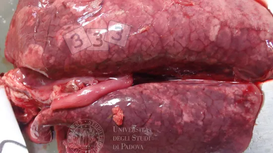 There is a disease outbreak with sudden deaths, inappetence, high fever and difficult breathing in pigs from 15 weeks until slaughter. The slaughterhouse inspection shows lungs like those in the image. What is the most likely cause?