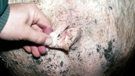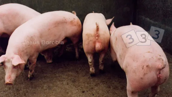 There is an increase in pigs with a swollen mass behind the rear legs, below the anus. It is most frequently located on the side. What is the most likely cause of this lesion?