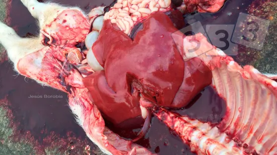 What is the cause of the liver lesion in this heavily pregnant sow found dead?